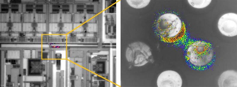 通过故障点处热辐射的相位差检测 3D 封装的故障深度(Z 轴方向),而不会损坏受电的 3D 设备,从而快速定位故障点(获取其 XYZ 坐标),进而得出缺陷落在焊球处的结论(见下图)。